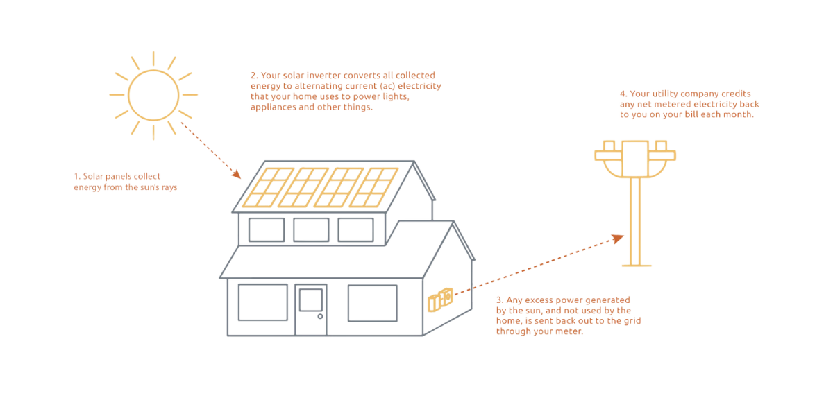 Solar panels collect energy from the sun's rays and convert it into usable electricity for your home. Any excess power generated by your solar system, and not used by the home, is sent back out to the grid through your meter.